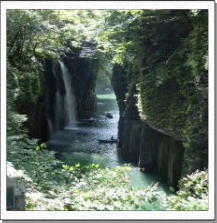 神話の舞台、高千穂は緑深い山の里。天照大神が隠れた岩戸を手力雄命が投げ飛ばしたと伝えられている場所ですが、